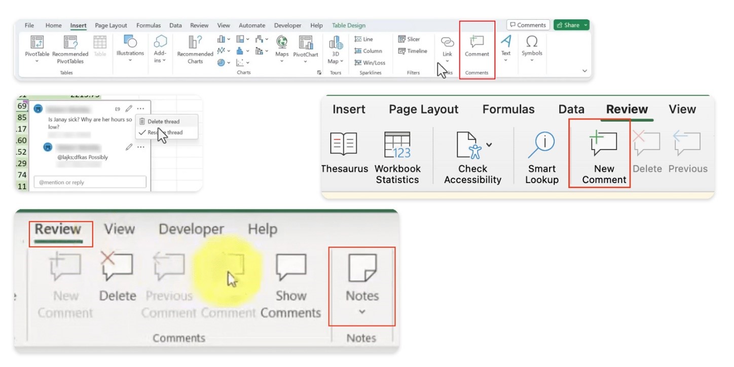 - Note: این قابلیت در اکسل 2019 به قبل نیز وجود داشته و برای افزودن توضیحات ساده و یادآوری ها روی سلول استفاده می شود. معمولا با یک کادر زرد رنگ قابل مشاهده هستند و همانند مورد بعدی، قابل بحث و اضافه کردن پاسخ نمی باشند. توجه داشته باشید که در نسخه های جدید اکسل، این مورد که Comment نامیده می شد، به Note تغییر نام داد.