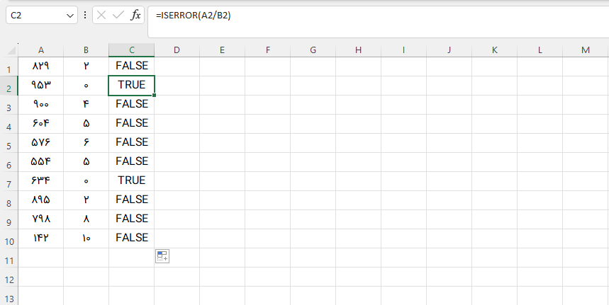 تابع ISERROR در اکسل تشخیص میدهد که آیا یک مقدار دارای خطا است یا نه، و در نهایت مقدار TRUE یا FALSE را بازمیگرداند: