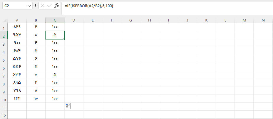 از تابع IF میتوان همراه با ISERROR استفاده کرد. در این حالت، اگر سلول حاوی خطا باشد مقدار 5 و در غیر این صورت مقدار 100 بازگردانده میشود: