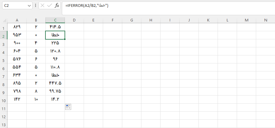 با استفاده از تابع IFERROR میتوانید سادهتر خطاها را مدیریت کنید. این تابع ابتدا فرمول را اجرا میکند؛ اگر خطایی وجود نداشته باشد نتیجهی فرمول نمایش داده میشود و در صورت وجود خطا مقدار جایگزین مشخصشده برگردانده میشود: