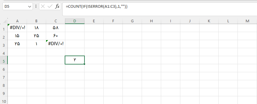 میتوان با ترکیب توابع COUNT، IF و ISERROR تعداد کل خطاها در یک محدوده سلولی را محاسبه کرد: