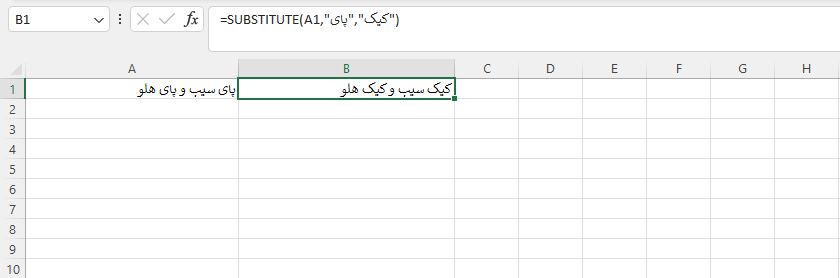 اما زمانی که موقعیت کاراکتر یا بخشی از متن را برای جایگزینی میدانید، باید از تابع REPLACE کمک بگیرید.. در مثال زیر، تابع SUBSTITUTE کلمهی پای را با کیک جایگزین میکند.