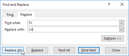متنی که قصد دارید پیدا شود (TX) و متنی که میخواهید جایگزین شود (CA) را وارد کنید.